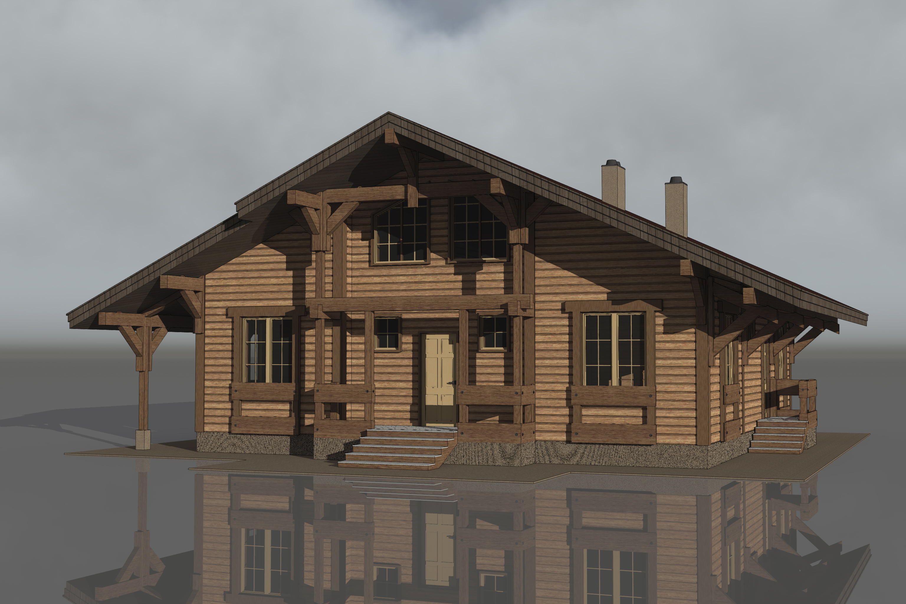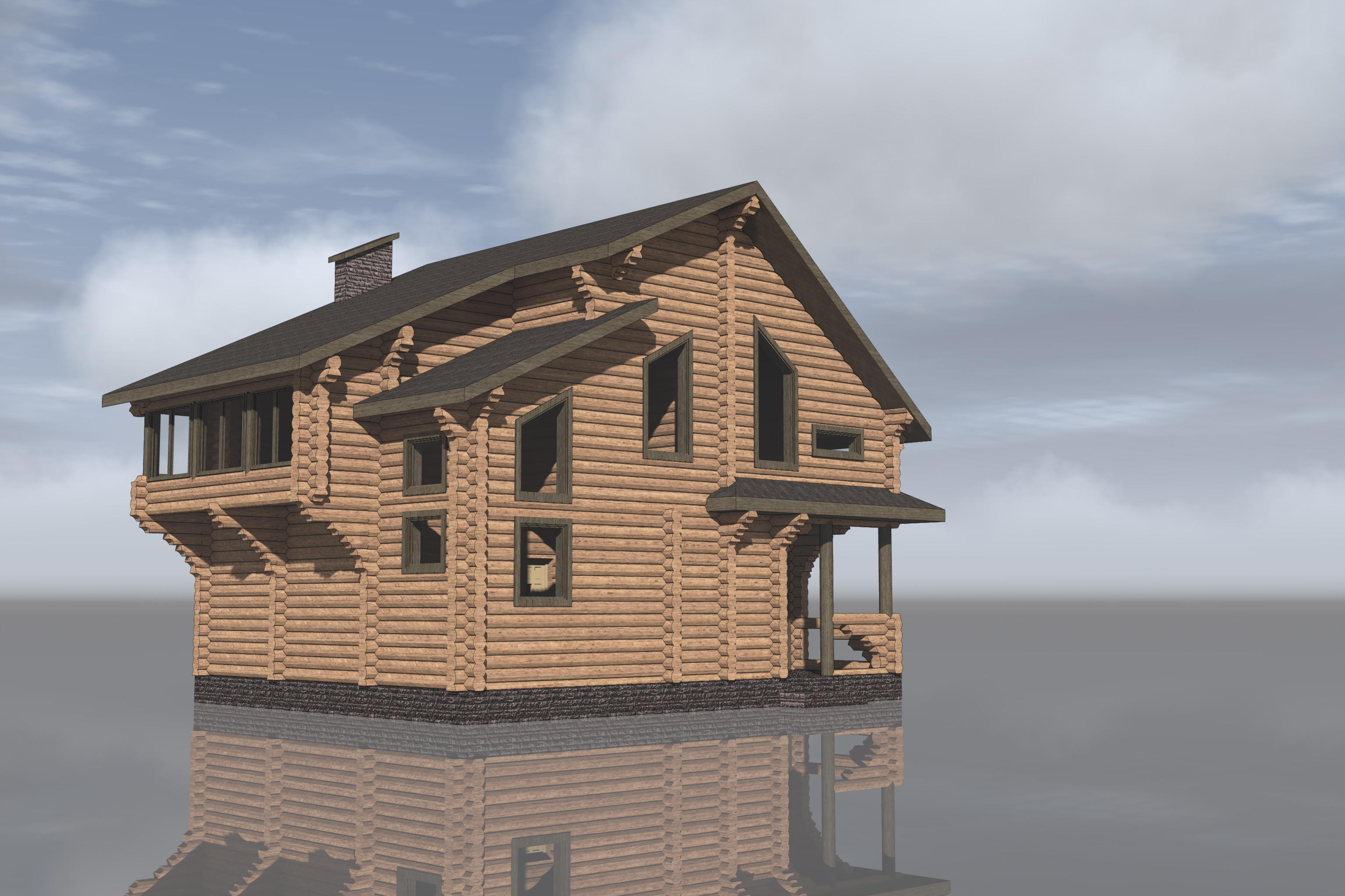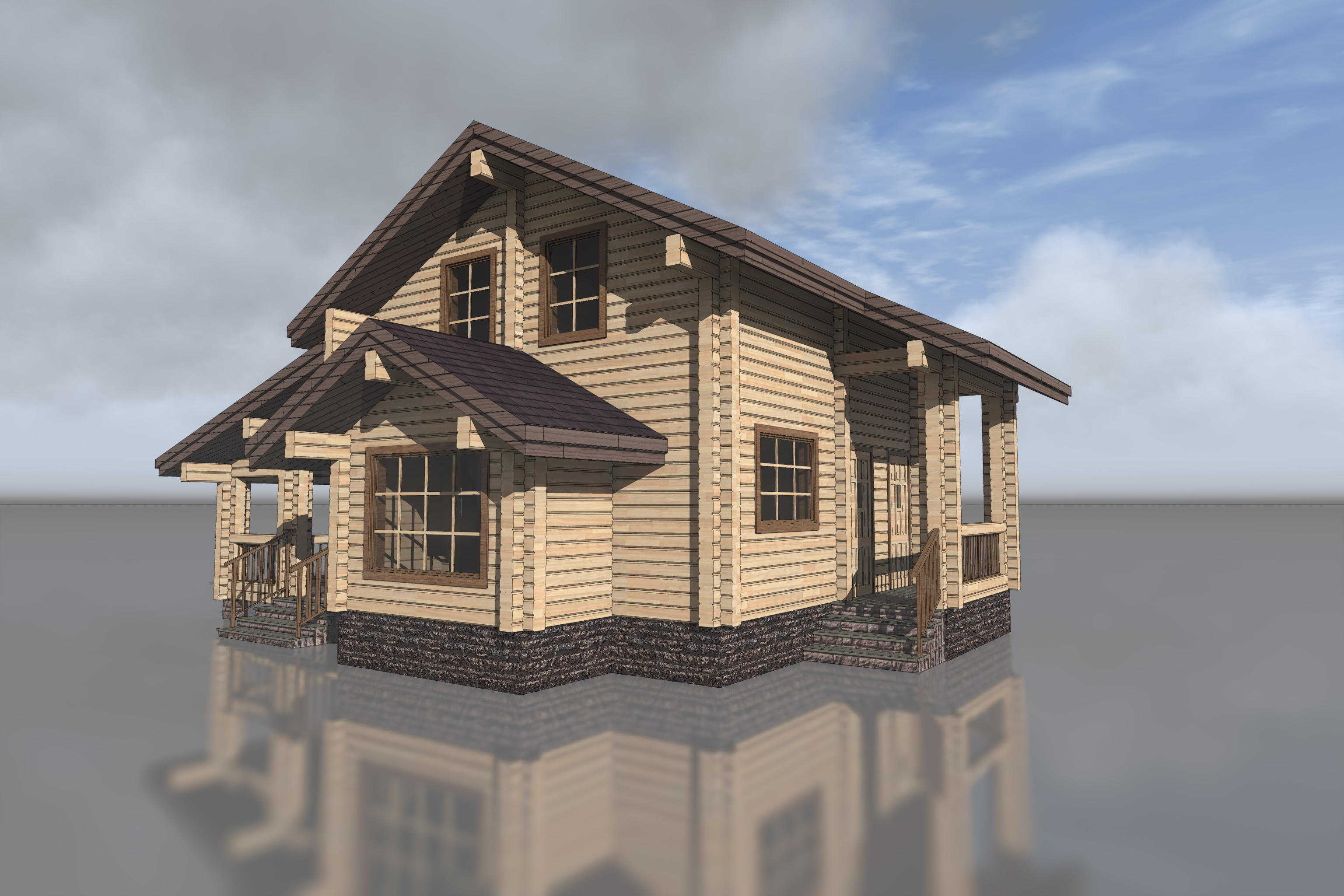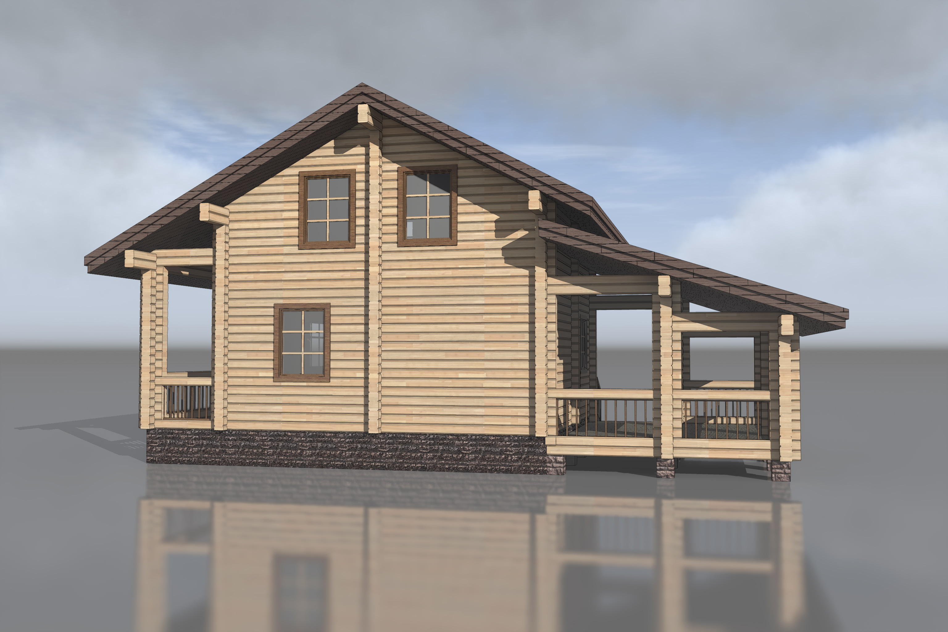 Первые этажи отделываются грубой штукатуркой, мансардные - обшиваются деревом с имитацией бруса. Балконы и террасы полностью отделаны деревом.