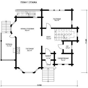 В самом центре первого этажа расположен довольно просторный холл. Он ведет во все помещения этажа: помимо уже упомянутой совмещенной кухни и гостиной, это санузел, гостевая комната и гардеробная. Прямо из холла можно попасть и на мансардный этаж: туда ведет двухмаршевая лестница.