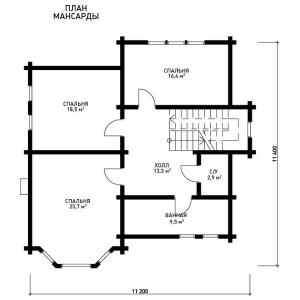 В центре мансардного этажа располагается холл, спроектированный по аналогии с первым. Все три спальных комнаты, а также санузел и очень солидная по размерам ванная имеют выходы в холл.